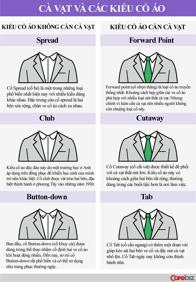 Vậy những kiểu cổ áo nào bắt buộc phải đeo cà vạt, kiểu cổ áo nào có thể mặc thoải mái? Hãy cùng tìm hiểu qua hình ảnh dưới đây.